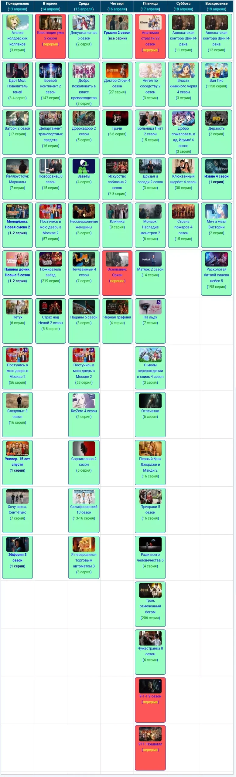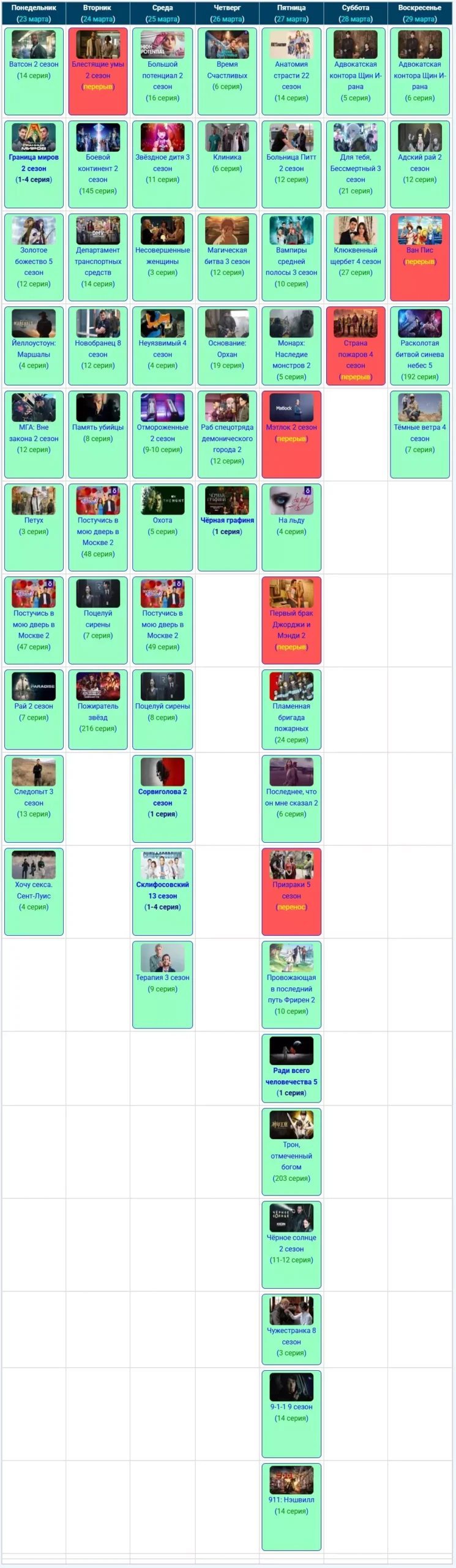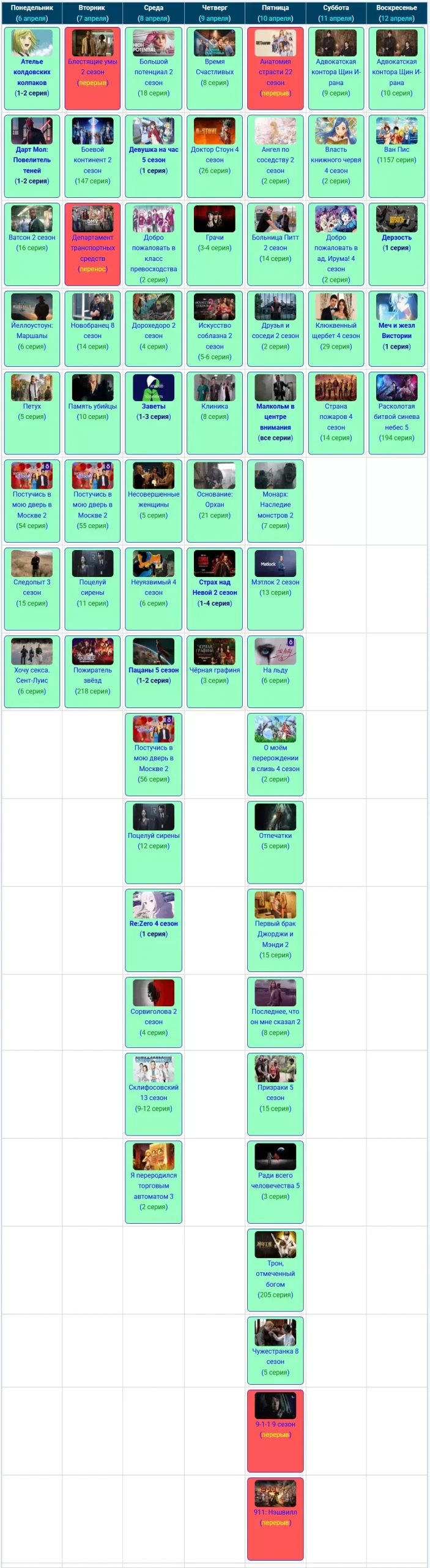Если вы относитесь к тем людям, которые любят полистать старые телепрограммы и вспомнить что выходило на прошлой неделе, тогда вы попали по нужному адресу, тут мы храним архивные скриншоты из графика расписания серий за предыдущие недели или даже месяцы, начиная с июня 2025 года.