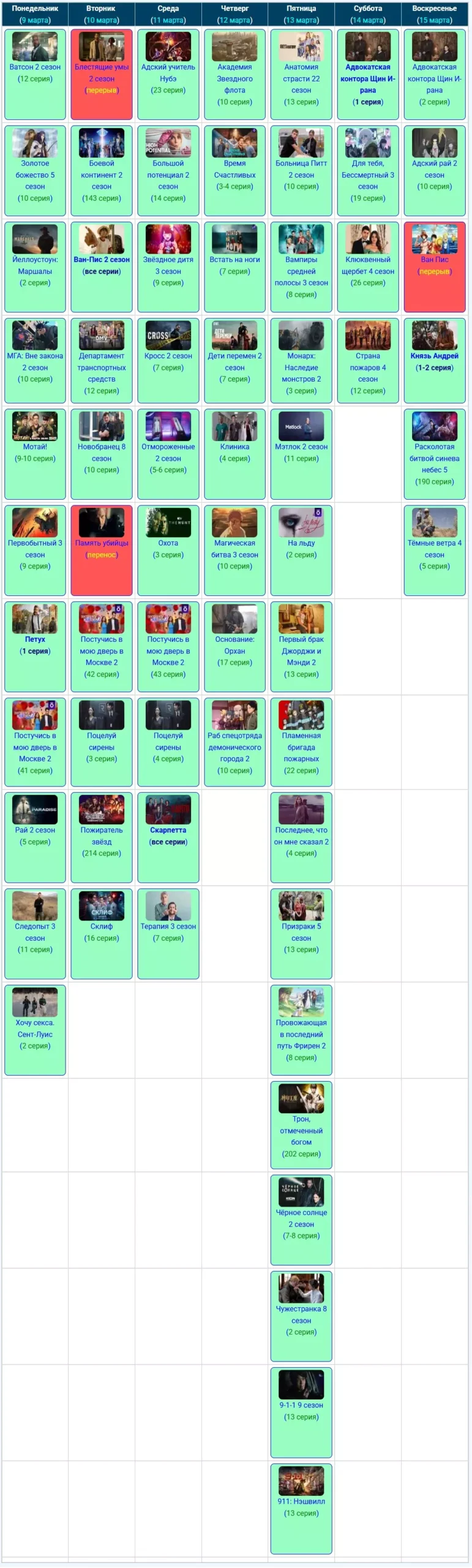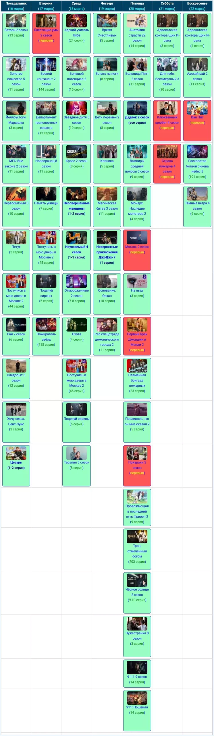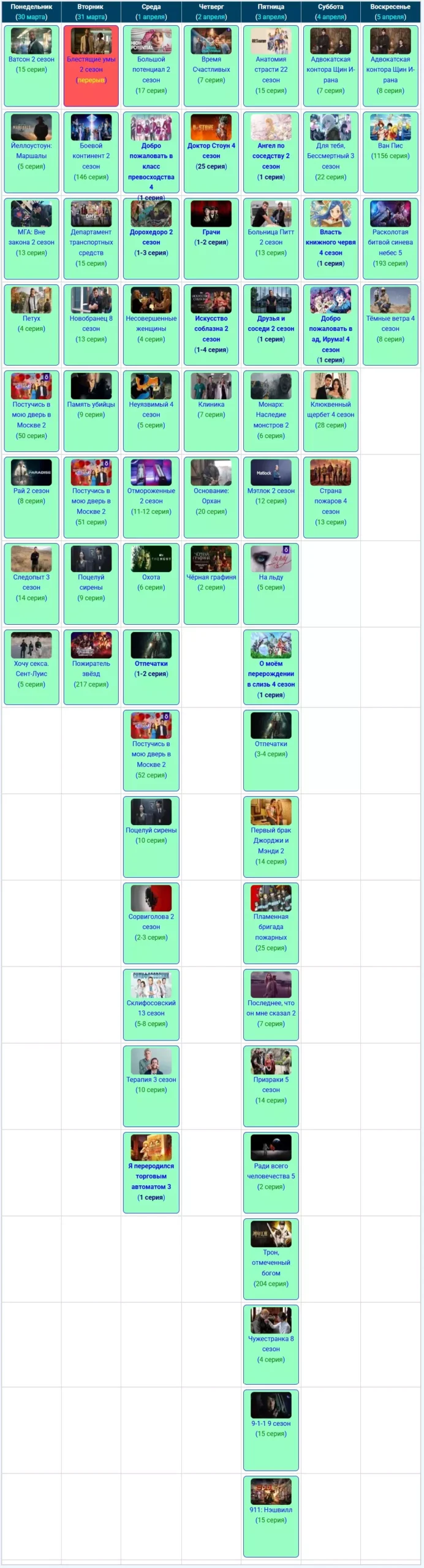 Если вы относитесь к тем людям, которые любят полистать старые телепрограммы и вспомнить что выходило на прошлой неделе, тогда вы попали по нужному адресу, тут мы храним архивные скриншоты из графика расписания серий за предыдущие недели или даже месяцы, начиная с июня 2025 года.